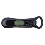 The Mario Digital Meat Thermometer is the perfect solution for cooking food to its optimal result while grilling, baking or deep frying. The foldable probe is made from food grade stainless steel and the thermometer is rated IPX7 waterproof which keeps it safe and protected while rinsing clean after use. It features a large LCD screen displaying the temperature, backlight feature for better visibility in dark spaces, automatic shut-off and has a fast 2-3 second response time. The thermometer has a wide range of -58F~572F (-50C~300C) and can be switched between Fahrenheit (F) and Celsius (C). Store the Mario easily using the internal magnet on the backside or hang it on a hook using its integrated bottle opener. Refer to the temperature chart printed on the back of the thermometer to gauge when your meat is cooked to perfection. Gift box and button cell battery included. Complies with Prop 65. 7″ W x 2 1/8″ H x 13/16″ D