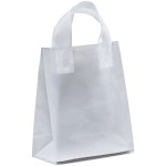Frosted hi-density plastic bag is made with fused loop handles and a cardboard bottom insert. 8″ W x 4″ D x 10″ H