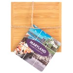This State Puzzle Coaster Set with Case offers a natural solution for protecting tabletop. These sturdy coasters are crafted from organically-grown Moso® bamboo, an environmentally-friendly material solution that quickly re-grows once harvested. Bamboo is both lightweight & durable a perfect choice for coasters! The coaster set includes a handsome case to store coasters neatly when not in use. The coasters are easy to care for as well: simply wipe them with a damp cloth to clean. Complies with Prop 65. 4″ W x 4″ H