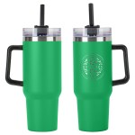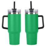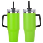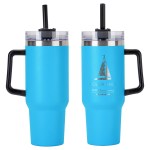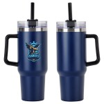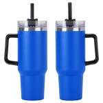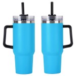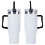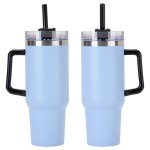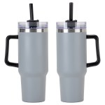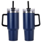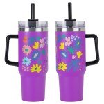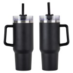 The Maxim 40 oz Mug with Straw is a popular dupe for retail. Made of stainless steel with a matte finish that is vacuum-insulated and double-walled. Comes with clear screw-on lid with a high-wall leak resistant feature, and has 3-position black swivel top. Also comes with black plastic straw with ring to keep it inside, and black plastic handle that is 4″ tall and sticks out 1-1/4″ at the widest part. Keeps drinks hot or cold for up to 6 hours. Hand wash only. BPA Free and FDA certified. Complies with FDA, Prop 65. 10.375″ H x 3.75″ Diameter