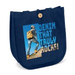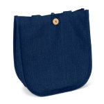 The reusable MB™ Denim Tote is made of durable 12-oz. cotton with a classic dark-wash denim look. The bag features a stylish curved bottom, a wooden button with loop closure, and 28″ long denim handles. An optional plastic bottom insert is available for purchase. *Due to the natural character of denim fabric, slight color variances will occur between bags. 12″ W x 5″ D x 13″ H