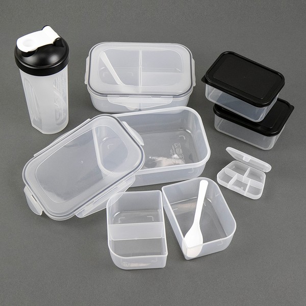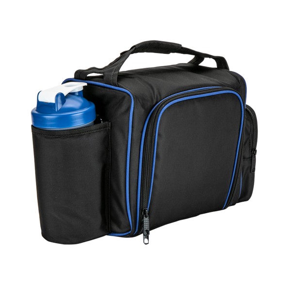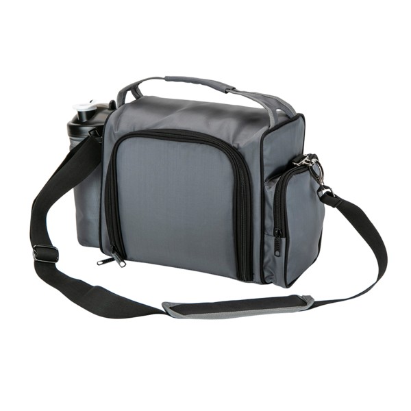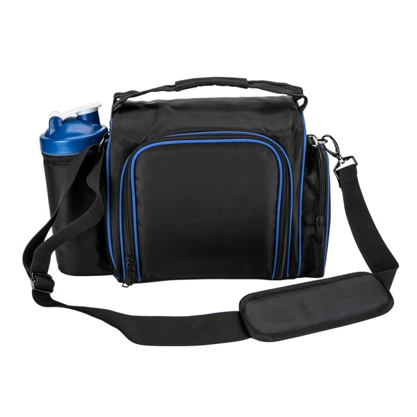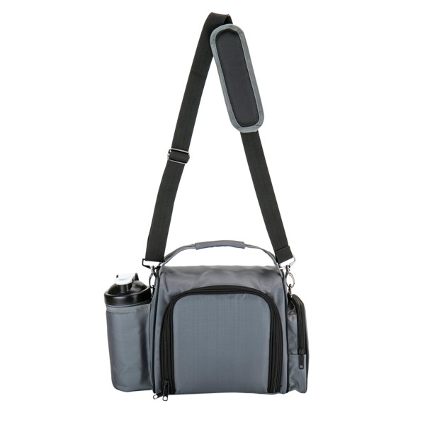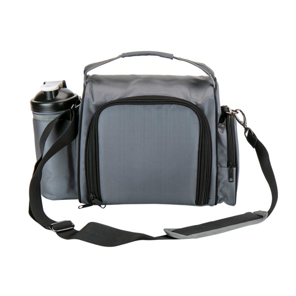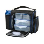 Meal prepping essentials includes large cooler with an easy access large front opening and zipper closure; a side bottle pocket, side zipper pocket, top grab handle, and adjustable shoulder strap; bottle with flip top lid; pill box; two snack or sauce containers; two large meal containers containing two removable dividers; and a spoon. Food containers are refrigerator, freezer, and microwave safe; top rack dishwasher safe. BPA Free. 8.6875″ D x 10.25″ H x 16.9375″ W