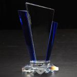 Angled blue accents make this piece stand out among the rest. Large imprint areas and steady clear bases finish out the piece. 5.125″ W x 9.5″ H x 3.0″ D