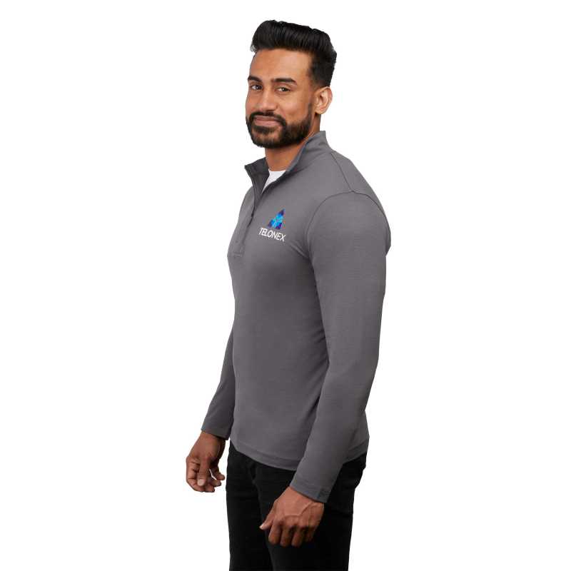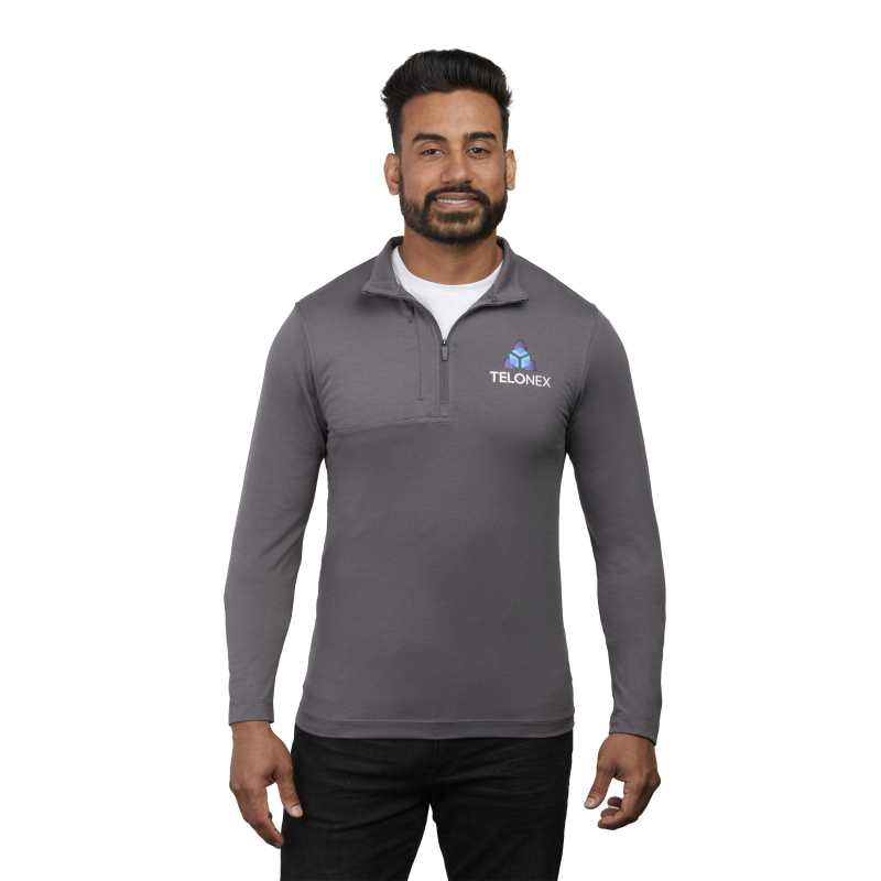 Trimark presents the IZU Everything Performance Eco 1/4 Zip for Men, highlighting fabric innovation. This versatile piece boasts stretch, antimicrobial, odor control, and UV protection properties for comfort and durability. Complete with a chest pocket and made from 85% recycled polyester certified by GRS, 10% lyocell, and 5% elastane, it seamlessly transitions from casual weekends to office attire. 0.00″ D x 0.00″ W x 0.00″ H