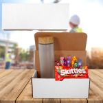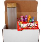 Introducing our exquisite shipping grade mailer box, featuring a stunning Bamboo Pattern 22 oz. Frosted Glass Bottle with a matching bamboo pattern on the lid. This luxurious set also includes a delightful assortment of Skittles and seven mini Tootsie Roll Pops to tantalize your taste buds. Experience the perfect blend of elegance and sweetness with this unique and thoughtful gift package. Complies with Prop 65. 10″ L x 4″ H x 4″ W