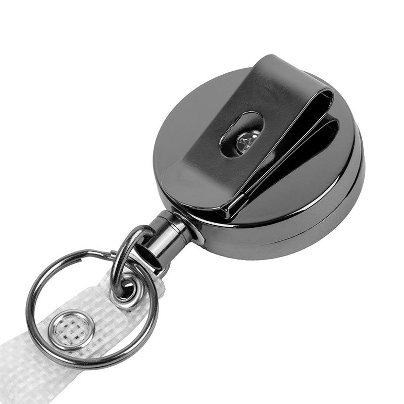 The Large Round Premium Metal Retractable Badge Reel is crafted from durable zinc alloy, featuring a polyester rope and PVC button for reliable, everyday use. Its strong steel clip provides secure attachment, making it perfect for professional environments where easy access to badges or keys is essential. 1 1/2″ W x 1 1/2″ H x 2″ D