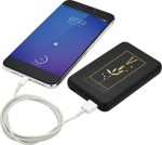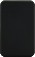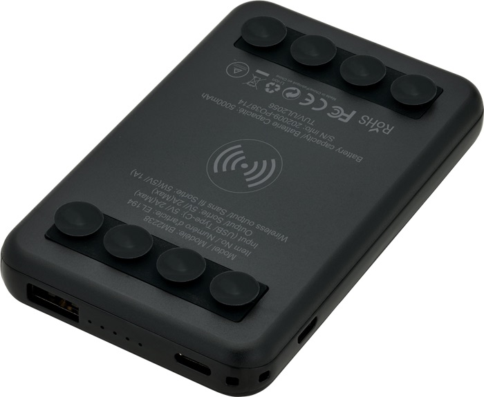 8 built-in suction cups on wireless charging surface hold your device. ABS black plastic shell. TUV/UL 2056 Certified. Power bank capacity: 5000 mAh. Dual USB and Type-C ports allow two devices to charge simultaneously. USB Output: 5V/2.1A. Micro USB Input: 5V/2A. Wireless Output: 5W 5V/1A. Approx power bank recharge time: 2-5 hours. Indicator lights Blue for battery levels; Red for wireless charging. Connect a USB cable to the device port for optional wired charging. 0.675″ H x 2.5″ W x 4″ D