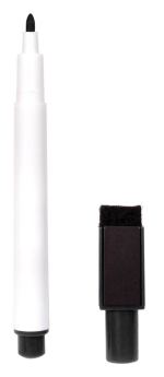 It’s made of polypropylene material, measures 4 1/2″, comes in several black or blue, is non-toxic, and comes with an eraser and magnet on the cap. This is perfect for teachers and those leading the discussion at work. Complies with Prop 65. 4 1/2″ L