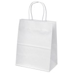 The Mini White Shopper is made with white kraft paper and features twisted paper handles and a serrated cut top. 8″ W x 4 1/2″ D x 10 3/4″ H