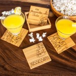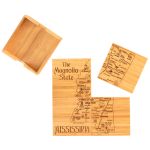 This State Puzzle Coaster Set with Case offers a natural solution for protecting tabletop. These sturdy coasters are crafted from organically-grown Moso® bamboo, an environmentally-friendly material solution that quickly re-grows once harvested. Bamboo is both lightweight & durable a perfect choice for coasters! The coaster set includes a handsome case to store coasters neatly when not in use. The coasters are easy to care for as well: simply wipe them with a damp cloth to clean. Complies with Prop 65. 4″ W x 4″ H