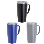 Mitre 20 oz Vacuum Insulated Stainless Steel Mug is made of stainless steel 304 interior with stainless steel 201 plus AS exterior that has a matte finish with comfortable welded handle and a clear plastic press on lid with sliding drink opening. Keeps beverages hot for up to 6 hours and cold for up to 8 hours. Hand wash only. FDA certified. Complies with CPSIA, FDA, Prop 65. 6.375″ H x 2.875″ Diameter