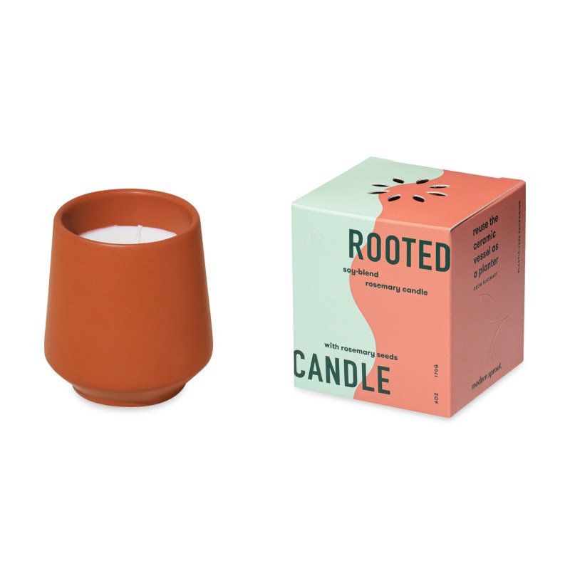 A 6oz soy-blend scented candle is outfitted in a matte glazed ceramic vessel and includes an organic seed packet to grow plant once the candle has been burned down. Candle and seed packet are packaged inside a beautifully designed box for easy gifting. Plastic-free packaging. 42 hour burn time. Gift box dimensions: 3.5”L x 3.5”W x 3.75”H. Complies with CPSIA, Prop 65. 3.25″ W x 3.5″ H x 3.25″ L