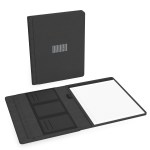 A professional, eco-friendly portfolio designed for organized and efficient work. The cover is made from recycled PU combined with recycled PET for durability and sustainability. Inside, it includes a removable notepad with 20 lined sheets featuring margin and date markers for structured note-taking. Additional features include a pen loop for quick access, one large folio compartment for documents, three multipurpose elastic compartments for accessories, and four card slots for business or ID cards. Ideal for executives, sales professionals, and anyone who needs a polished, all-in-one solution for meetings, presentations, or travel. 9.5″ L x 12.25″ W x 0.875″ H
