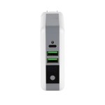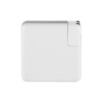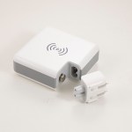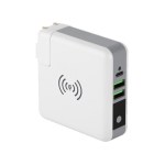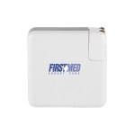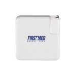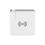 Portable power on the go or at home! UL and ETL listed 6700 mAh Qi wireless charging powerbank/wall adaptor. Features interchangeable wall adaptors (only includes Type A); dual USB ports; type-C input; foldaway prongs; digital battery indicator light. Input: AC90-240V 50/60Hz 0.5a; output: 5V/2.4A; wireless charging output: 5W. 3.125″ D x 1.125″ H x 3.125″ W