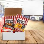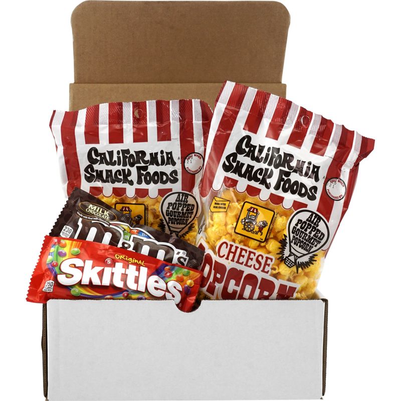 Shipping grade mailer box. 2 bags of cheese popcorn. 1 package each of Skittles and M&M’s. Complies with Prop 65. 10″ L x 4″ W x 8″ H