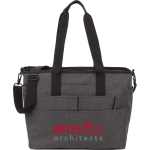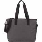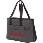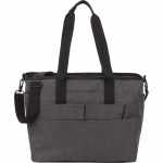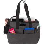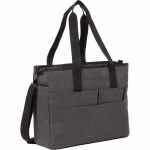 Designed to handle daily work commutes to the office or the casual long-weekend travel — the Multi-Pocket Laptop Tote offers both functionality and style. Featuring a padded laptop compartment that holds 16” laptops, and a separate tablet compartment with a hook-and-loop strap to secure them in place. Carry this tote using the adjustable crossbody strap, or the sturdy grab handles. On the front of the tote you’ll find six pockets of various sizes to keep and all the daily essentials organized. The side pocket has an elastic band to accommodate various drinkware styles and sizes, and the crossbody strap has styles sturdy metal clips that allow it to be removed when not in use. This tote is made using 300D rPET fabric. 5.75″ D x 17.00″ W x 13.50″ H
