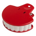 Provides a smile and a reminder, as it tightly seals food bags, or neatly organizes coupons. Ideal for dentist’s office, fund-raisers, health clinics or anyone who wants to “take a bite” out of the competition. New Stronger Spring! Optional magnetic backing available. 3″ W x 3″ H x 1″ D