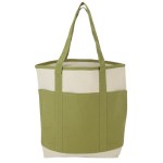 Natural 10 oz. cotton canvas two-tone tote offers three front pockets and a 5 3/4″ x 4 1/4″ tethered zippered pouch inside. There are also a 5 1/2″ gusset, hook and loop closure and 22″ handles. Complies with Prop 65. 11″ W x 15″ H x 5 1/2″ D