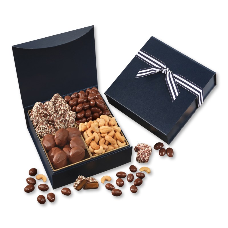 This stylish navy blue magnetic closure gift box is a veritable treasure trove of sweet and salty treats! Four premium delights come nestled in this box: crunchy English butter toffee, mouthwatering caramel pecan clusters, our famous chocolate covered almonds, and perfectly-roasted fancy cashews. The reusable box comes tied with striped grosgrain ribbon and features your logo on the lid for a lasting reminder of your thoughtfulness. Complies with CPSIA, FDA, Prop 65. 7.75″ L x 7.75″ W x 2.5″ H