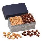 For those who are nuts about nuts – and that’s just about everyone – here are two delicious favorites in one package. You get a five-ounce bag of Chocolate Covered Almonds and a five-ounce bag of Extra Fancy Cashews, nestled into a navy and silver gift box, complete with your logo foil-stamped in silver on the lid. Complies with CPSIA, FDA, Prop 65. 7.375″ L x 3.875″ W x 2.25″ H