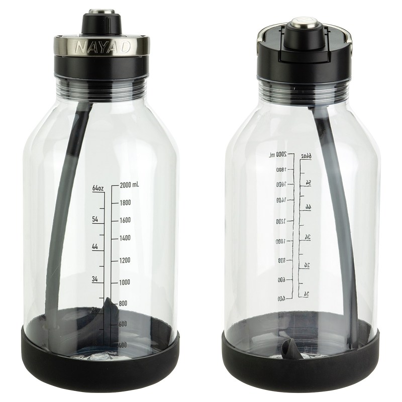 NAYAD® Voyager 84 oz Tritan® water jug with durable silicone base has measurements listed on side in both ounces and milliliters. Translucent bottle with markings and huge size make it easy to stay hydrated to reach health and fitness goals! Wide-mouth straw lid is 100% BPA-free ABS plastic with twist-top spout. Carrying handle on lid is made of zinc alloy for strength and durability. Generous capacity holds over 2 Liters! Hand wash only. FDA certified. Complies with FDA, Prop 65. 12″ H x 5″ Diameter