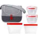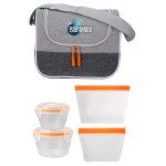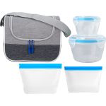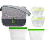 Introducing the ultimate set for all your on-the-go food storage needs! The Bay Cooler Bag features vibrant zipper pulls for a pop of color, while the Nesting Locking Lid Bowl Set includes vented lids for easy reheating. Keep your snacks fresh in style with the Medium Reusable Food Storage Bag, complete with a secure zip closure. Need more space? The Large Reusable Food Storage Bag offers plenty of room for all your favorite foods, also with a convenient zip closure. Upgrade your food storage game today with this versatile and practical set! Complies with FDA, Prop 65. 9.5″ L x 7.5″ H x 8″ W