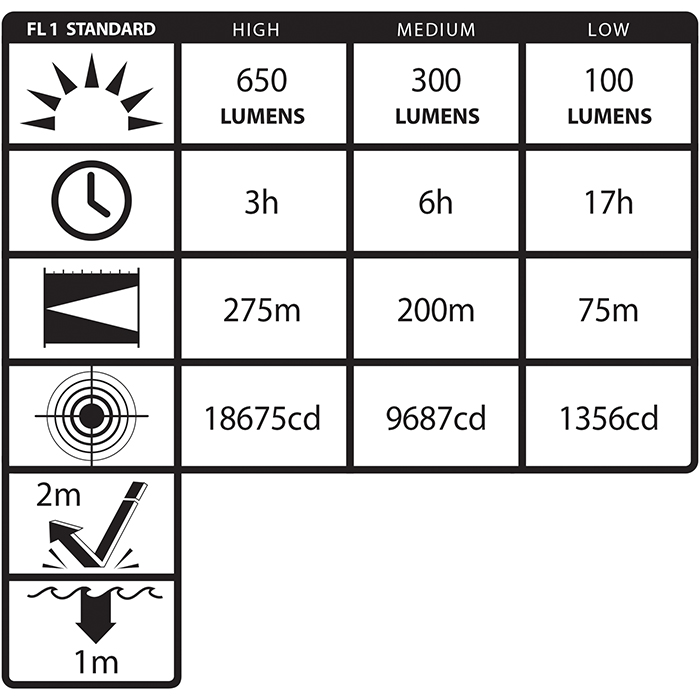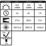 Certificate of Conformity, CREE® LED Bulb, Glass-filled Nylon Polymer housing, Integrated tail cap magnet, Output: 650 lumens(high), 300 lumens(med), 150 lumens(low) and strobe. Two body switches, Aircraft-grade 6061-T6 Aluminum bezel and tail-cap with Type III hard anodized finish. Dual-Light™ allow flashlight and floodlight to be used at the same time, IP-X7 Waterproof. Includes 1 rechargeable Lithium-ion battery, charger, AC and DC power supply and anti-roll ring, limited lifetime warranty. Complies with Prop 65. 1.625″ H x 1.625″ W x 9.5″ D