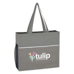 Made Of 80 Gram Non-Woven, Coated Water-Resistant Polypropylene. Large Front Pocket. Side Mesh Pocket. 3 ½” Gusset. 17″ Handles. Spot Clean/Air Dry. Complies with Prop 65. 3.5″ D x 15″ W x 13″ H
