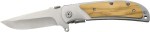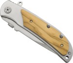 Blade is 420 Stainless Steel with satin finish Length of Blade only: 3.5; Length of product when blade is in closed position: 4.75″ NOTE: Handles are manufactured with real wood and may vary in color and grain from photo Includes a black Nylon pouch with hook and loop closure and belt loop Handle exterior is natural Olive Wood Integrated belt clip, thumb stud, and flipper for quick open. 1.375″ D x 4.75″ W x 0.75″ H