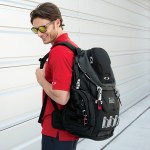 600D polyester/nylon construction backpack. Top storage compression-molded optics compartment; headphone port; padded sleeve for up to 17″ laptop; lockable cable zipper pulls to secure main compartment. Mid-body flap; bottom drainage ports for wet/soiled items; interior printed lining. Adjustable padded shoulder straps with sternum strap and mobile holsters. Removable padded waist strap with pockets; compression molded back panel with airflow channels; rubberized bottom for moisture protection. 7″ D x 20″ H x 14″ W