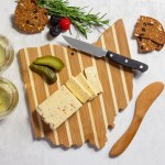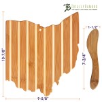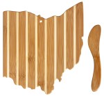 Show off your favorite state with the stylish Totally Bamboo Ohio Charcuterie Board with Spreader Knife Gift Set! This beautifully crafted cheese board set is shaped to the outline of Ohio and features inlaid stripes of light color bamboo. This charcuterie board is a great way to serve guests crackers, cheeses, meats and other appetizers. The included bamboo spreading knife is ideal for spreading soft cheeses, dips and sauces onto crackers or bread. 9 1/4″ L x 10 1/8″ W x 1/2″ H