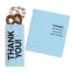 A Sweeter Card is a greeting card and gourmet treat in one. This gift features your logo foil-stamped in one color of your choice on the inside. The pre-designed card features a sentiment of gratitude and comes packed with two scrumptious jumbo pretzels, hand-dipped in rich chocolate—one milk, one white—then drizzled with contrasting stripes to create a delicious sweet and salty sensation. Choose the imprint color from the choices below and send us your logo. Complies with CPSIA, FDA, Prop 65. 7.75″ L x 3.5″ W x 0.5″ H