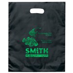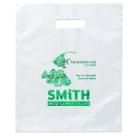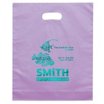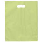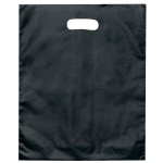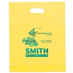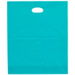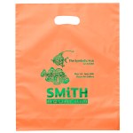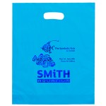 Colorful frosted hi-density plastic bag features die cut handles and a bottom gusset. 12″ W x 3″ D x 15″ H