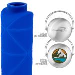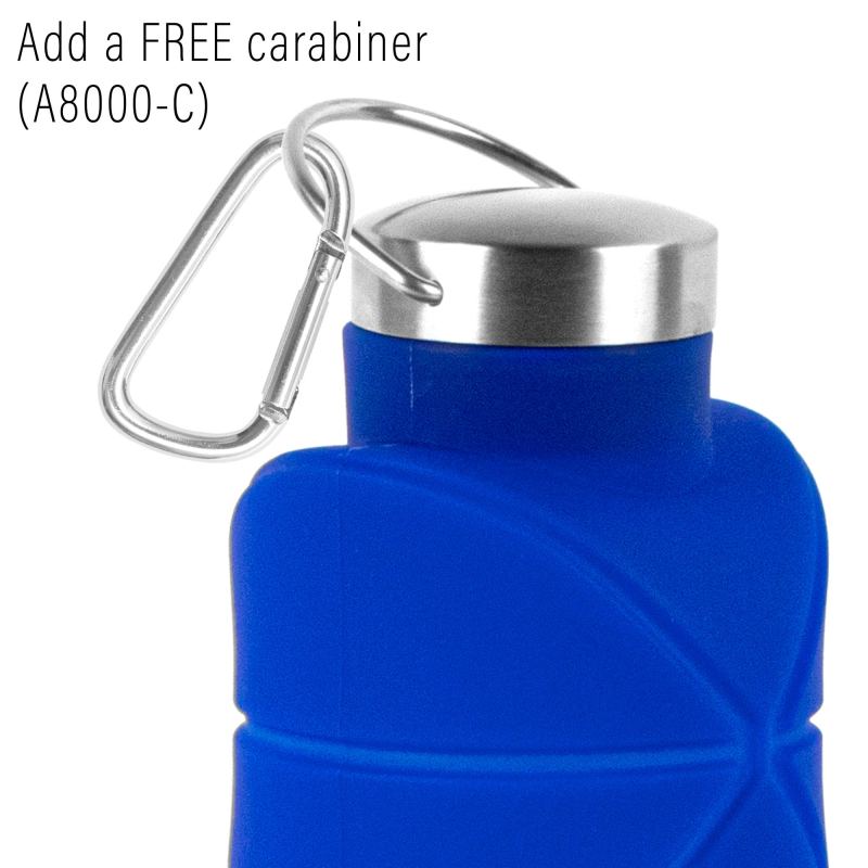 Perfect for travel, this bottle folds/collapses to a nice compact shape to store in a purse, backpack, tote, or briefcase! Features: 25 Oz. capacity, stainless steel screw-on lid, convenient handle for carrying, or clipping a carabiner, folds to 2 1/2″h. Stands 9″h when unfolded, made of food-grade, FDA-approved silicone, which is non-toxic and BPA-free, dishwasher and microwave safe (except for the lid), safe for liquids up to 140 degrees F. Add a carabiner. 9″ H