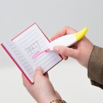 Double sided highlighter with white case and neon accents. Features ergonomic design for highlighting comfortably. 4.875″ L x 1″ W