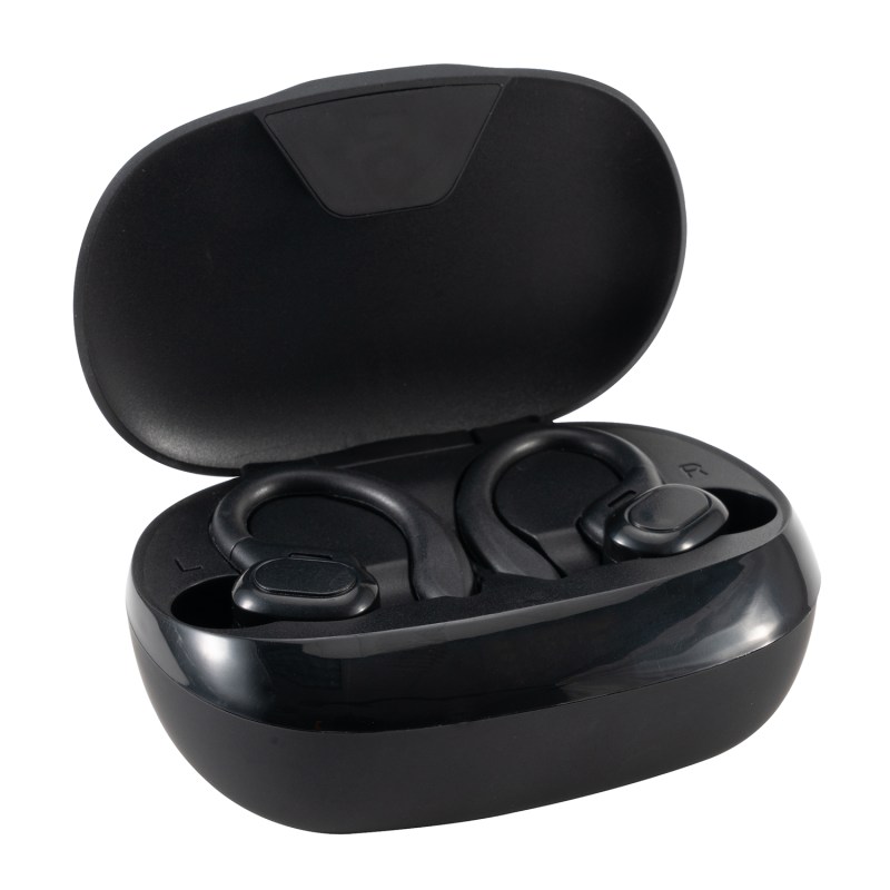 These high quality TWS earphones fit over the ear for extra comfort. They even stay in your ears while you are working out. The earphones have a 30 mAh capacity so that you can charge them multiple times before recharging the case. The digital readout lets you know the charging status. 3.625″ W x 2.625″ H x 1.375″ D