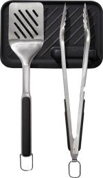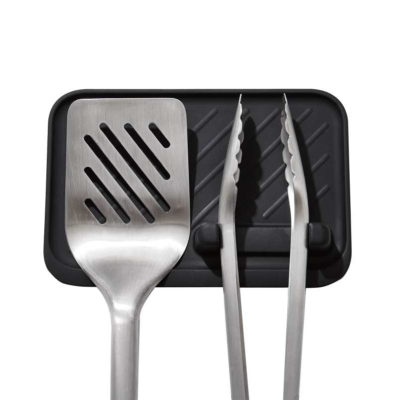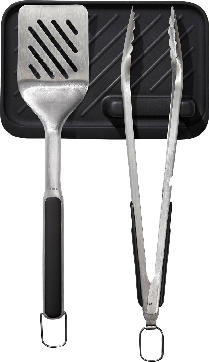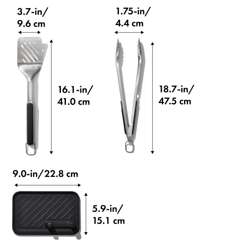 The OXO Good Grips 3-Piece Grilling Tool Set is a must-have for beginner and seasoned grillers alike. The set includes Grilling Tongs (with scalloped edges for fumble-free grabbing and a built-in bottle opener for grill-side sipping). A Grilling Turner (with a double-bend design for leverage while flipping). Finally, the Grilling Tool rest provides a neat, heat-resistant surface to rest your tools while you grill. The non-stick silicone construction and unique tong holder help with one-handed use-no more locking and unlocking tongs between turns. The tongs and turner have extra-long handles and non-slip grips for comfort and control. Non-decorated components are dishwasher safe. 4.00″ D x 9.00″ W x 15.00″ H