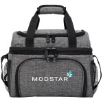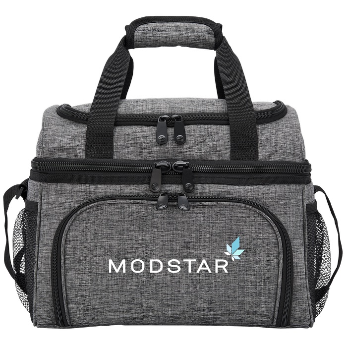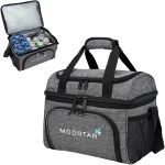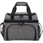 This cooler has a 24 can bottom compartment capacity with smaller separate top compartment. It is made of 300D Polyester with 15C PEVA, 210D Polyester lining. Features front zipper pocket and 2 mesh side pockets, sturdy #10 zippers designate main compartment, PEVA heat-sealed lining in bottom compartment, and an adjustable shoulder strap with padded hook and loop secured handles. 11″ H x 13″ W x 9″ D