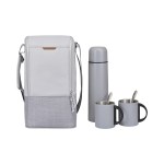 The Parkview Insulated Coffee-to-Go Carry Tote is the perfect gift set for coffee lovers on the move. Crafted with recycled poly in a modern color-block design, it features a roomy insulated main compartment, interior organization, and an adjustable strap. Includes a 24 oz stainless steel thermos, two 8 oz mugs, and two spoons-ideal for picnics, commutes, or outdoor gatherings. Coffee not included. Only the tote is customizable. Complies with CPSIA, Prop 65. 3.5″ W x 13″ H x 7″ L