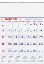 This calendar features 13 sheets of 50 Lb. white offset paper and a black tin at the top with a hanger. Includes 13 months (December to December) with memo lines in date blocks and symbols denoting days elapsed and remaining in the year, work days remaining without Saturdays and Sundays, and work days remaining without Sundays, all pre-printed in red and blue. Also includes American and major Canadian holidays and moon phases. 18″ W x 25″ H