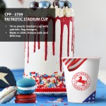 Celebrate your American pride with our 16 oz plastic stadium cup featuring patriotic flag designs. This cup is proudly made in the USA and is both freezer safe and BPA free, ensuring a safe and durable option for all your beverage needs. Stand out at your next event with this stylish and functional cup that represents the red, white, and blue. Complies with FDA, Prop 65. 3.5″ D x 4.25″ H
