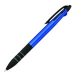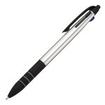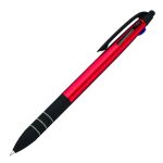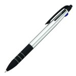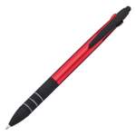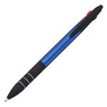 Plastic click action, 3 color (red, blue, black) ballpoint pen with rubber grip and stylus.