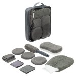 Keep your car spotless inside and out with the Pit Crew 9-Piece Car Wash Detailing Kit. This complete set includes microfiber cloths, applicator pads, a wash mitt, sponge, and tire brush for every cleaning task. Made with durable, absorbent materials, it removes dirt and grime with ease. Packaged in a convenient PVC + Oxford pouch, it’s perfect for car enthusiasts, at-home care, or professional auto shops. Complies with Prop 65. 11″ L x 2.25″ W x 12″ H