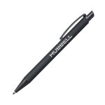 Sleek matte black metal pen with a rubberized coating for a super comfortable writing experience. A colored chrome accent can be found beside the clip with a matching laser engraved chrome logo underneath. Product Size: 5.6″ W x 0.58″ H. 5.6″ W x 0.58″ H