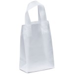 Frosted hi-density plastic bag is made with fused loop handles and a cardboard bottom insert. 5″ W x 8″ H x 3″ D