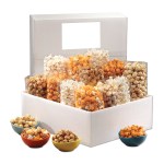 Tucked inside this unassuming white box is a flavor explosion! 12 bags of gourmet popcorn—2 each of 6 varieties—are packed together in a gift perfect for an office to share. On the outside of the box, a full-color label with your custom message is featured so that every recipient will know who to thank for the delicious experience. Complies with CPSIA, FDA, Prop 65. 16″ L x 13″ W x 6″ H