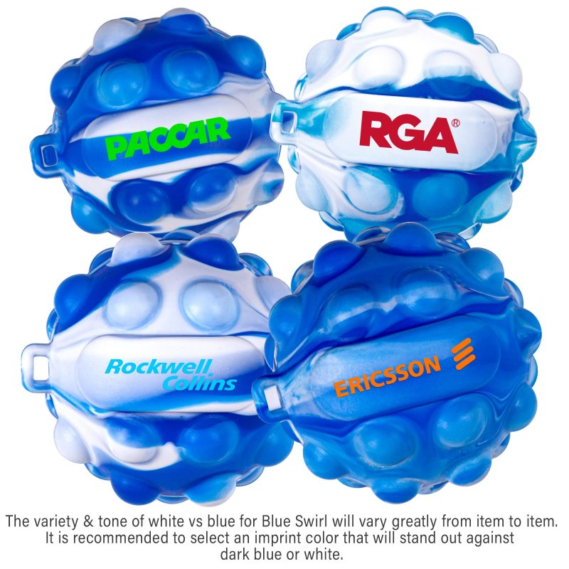 A wildly-fun, new way to relieve stress, this popper stress ball is great for people of all ages. Go ahead and pop it! Made of squeezably soft silicone. Relieves stress and helps with focus. Great for sensory issues. Interactive pop bubbles regain their shape with each squeeze. NOTE: These balls are lightly inflated and temperature will cause the balls to appear to inflate in the heat and deflate in the cold. Due to the curvature and light inflation, imprinting cannot always be straight. 3 1/4″ Diameter
