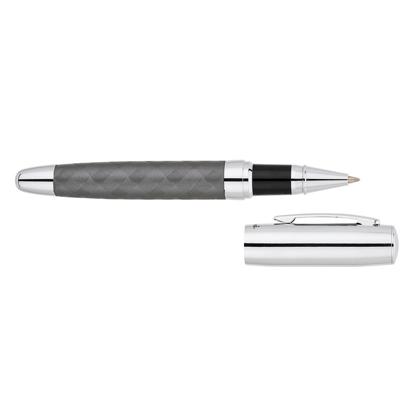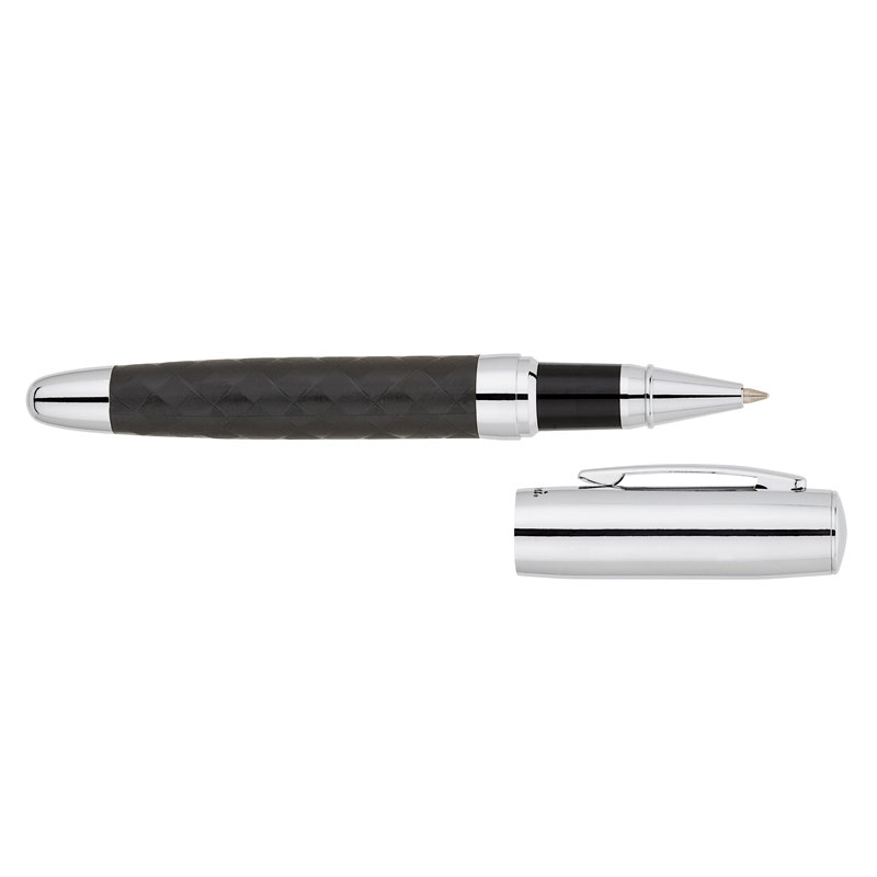 Cap off brass rollerball pen features a woven design barrel with chrome cap and tip. Complies with Prop 65. 3/4″ W x 5 1/4″ H x 5/8″ D