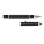 Brass cap-off Bettoni rollerball pen with carbon fiber barrel, chrome trims, and capacitive stylus that works with touch screen devices. Complies with Prop 65. 5/8″ W x 5 5/8″ H x 1/2″ D