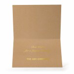 Award Winning Holiday Greeting Cards are the perfect way to convey your personal holiday message! Gold foil snowflake on Brown Kraft Fiber paper (see other style for green design), includes a 1 color gold foil-stamped stock sentiment & your logo or message w/free gold foil lined mailing envelopes, cards not inserted. See website for 38 stock sentiments or create your own with an additional charge. Over 100 Classic and Premium designs available. 5″ W x 7″ H